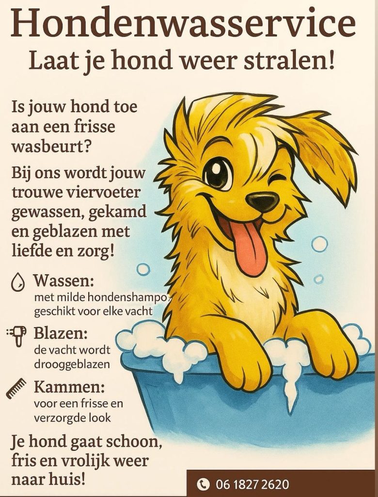 Mocht u hier interesse in hebben, dan kunt u contact opnemen via telefoonnummer 0618272620 of per e-mail via suuz.kastelein@icloud.com.De prijs van de wasbeurt wordt berekend op basis van de grootte van de hond en het type vacht.